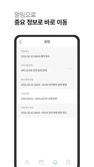 중요한 알림을 놓치지 않도록 리스트로 알려드립니다! 공지사항, 관련 정보 등 알림이 뜬다면 터치 한번으로 해당 정보로 쉽게 접근할 수 있습니다.
