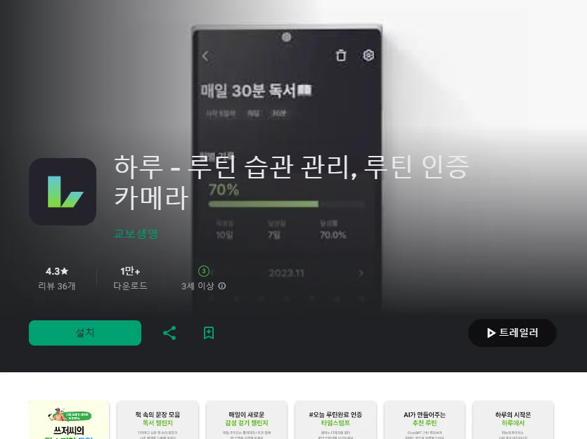 이 어플은 구글플레이스토어에서 "좋은 습관 만들기"로 검색했을때 4번째로 나오는 어플입니다. 아래는 하루 - 루틴 습관 관리, 루틴 인증 카메라 어플에 대한 자세한 설명이니 참고하세요.