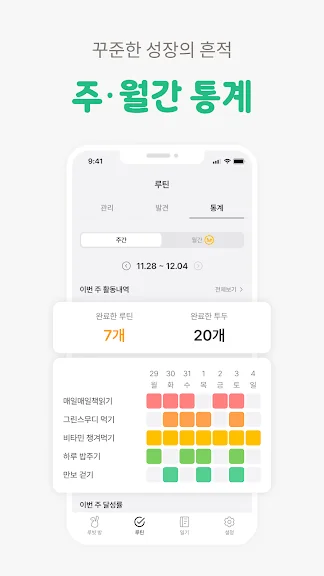 - 이번 달 루틴 실천율 궁금하다면 월간 통계를 활용해요.