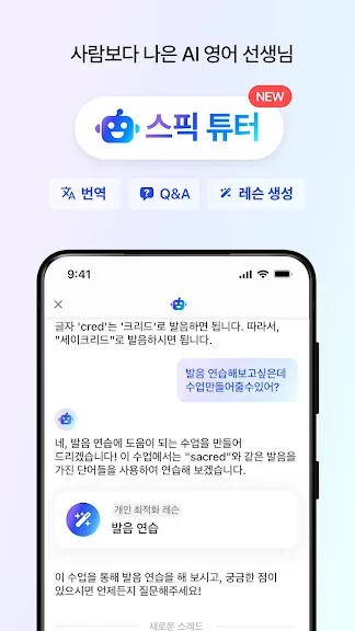 스픽은 현존하는 가장 빠르고 정확한 음성 인식 기능과 인공지능 기술을 활용한 영어 학습 앱으로, 기존에 없던 영어 회화 학습법을 선보입니다.