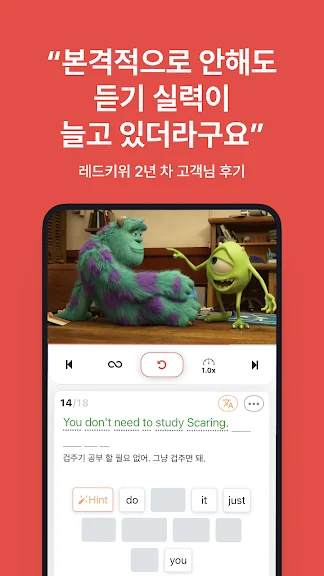 영어 공부하려고 미드를 재생했는데, 영상만 틀어놓고 멍 때리고 있다구요? 레드키위에서는 그럴 일 없어요! 반복해서 듣고 단어를 클릭해 문장을 완성해보세요. 지루할 틈 없이 연습하면서, 리스닝 실력 상승! 들을 줄 알아야 회화도 하죠!