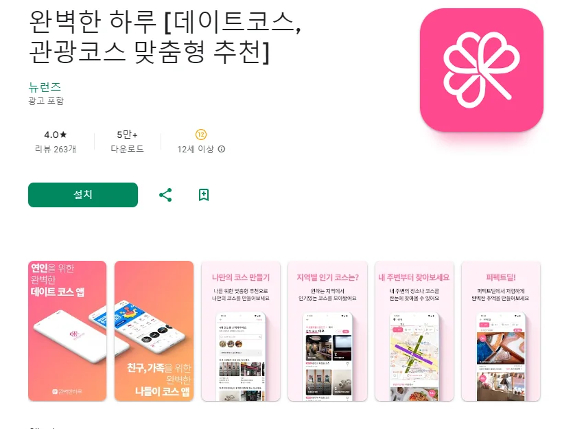 이 어플은 구글플레이스토어에서 "데이트 코스 추천"로 검색했을때 2번째로 나오는 어플입니다. 아래는 완벽한 하루 [데이트코스, 관광코스 맞춤형 추천] 어플에 대한 자세한 설명이니 참고하세요.