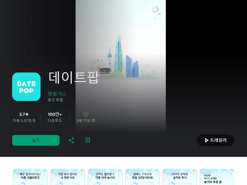 이 어플은 구글플레이스토어에서 "데이트 코스 추천"로 검색했을때 1번째로 나오는 어플입니다. 아래는 데이트팝 어플에 대한 자세한 설명이니 참고하세요.