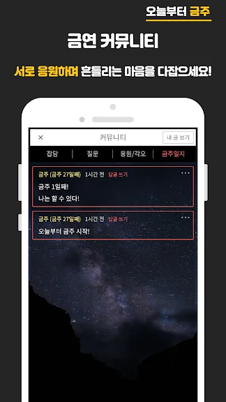 - 첫화면에서 금주 기록을 확인하여 마음을 다잡으세요.