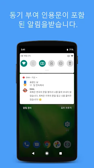 자기 발전 탐색 여정에서 동기와 집중력을 유지할 수 있도록, Quitzilla는 다양한 유명 작품에서 뽑은 “오늘의 명언”을 표시할 것입니다.