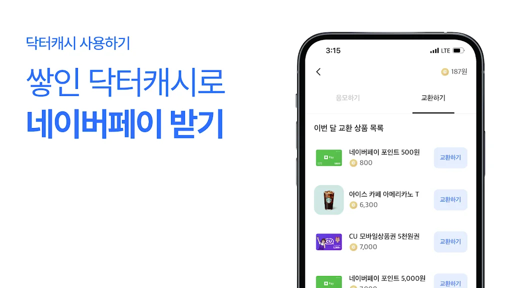 - 닥터캐시로 리워드 사용하기: 네이버페이, GS25, CU, 세븐일레븐 상품권까지 매일 매일 모은 닥터캐시를 원하는 곳에 사용할 수 있어요. 건강습관도 기르고 생활비도 아껴보세요!