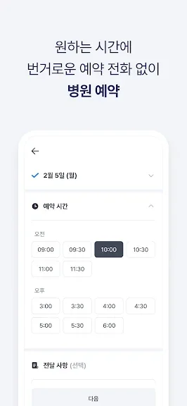 - 대기 없는 바로 예약 시스템: 앱에서 병원을 예약하고, 간편결제까지 한 번에 등록하고 대기 없이 병원에서 진료받아 보세요.