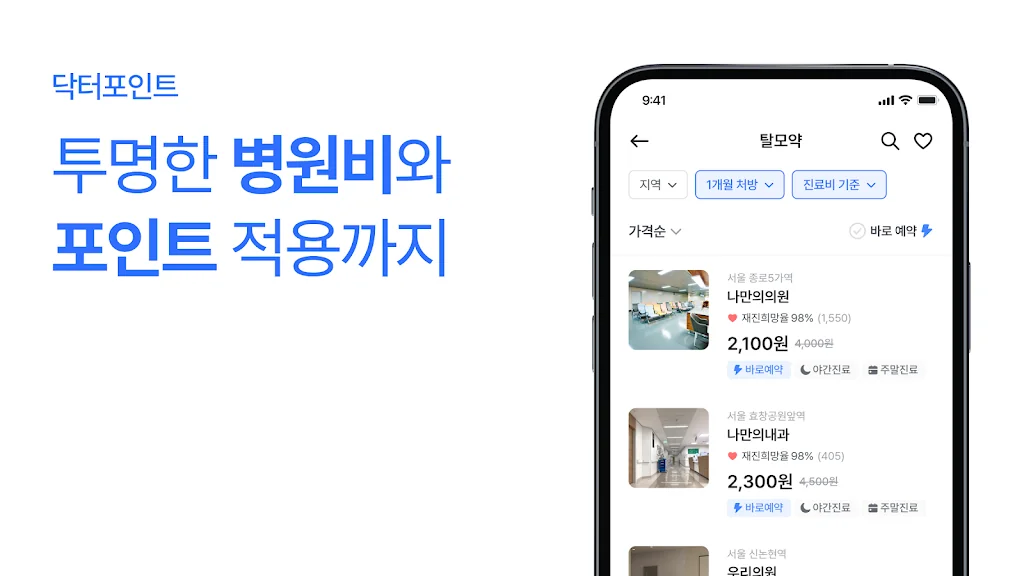 - 닥터포인트 적용: 건강지원금으로 받은 닥터포인트를 활용해서 더 합리적인 가격으로 병원을 예약하세요.