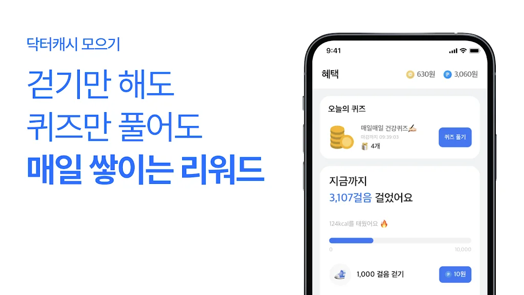 - 돈 버는 만보기: 매일 1,000걸음을 걷기만 해도 돈 버는 만보기를 써보세요. 닥터포인트부터 닥터캐시와 포인트박스까지, 다양한 리워드를 만나보세요. 친구들과 걷기 모임을 함께 하면 더 많은 리워드 혜택을 모을 수 있어요.