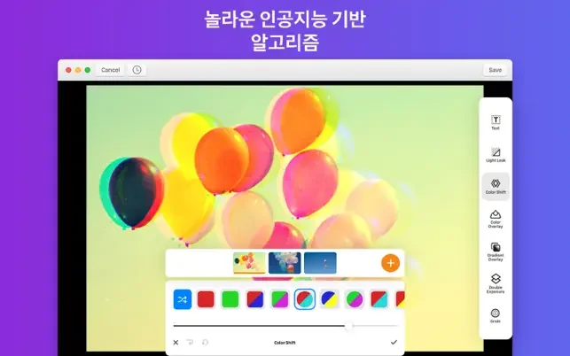 - 그레인, 색상 전이, 이중 노출, 색상 및 그라데이션 보정