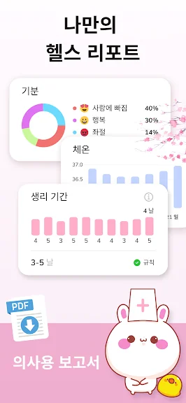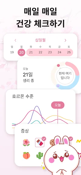 - 증상 패턴: 생리 주기와 증상을 추적하여 생리 패턴을 파악하고 몸의 신호를 더 잘 이해할 수 있습니다.