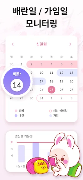 - 비가임기, 가임기, 배란기, 예정일, 생리 기간을 알려주는 직관적인 달력