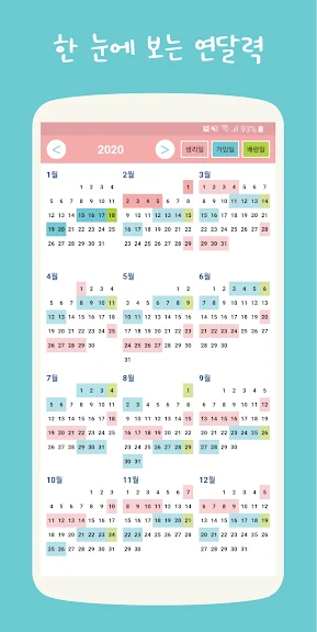 - 비가임기, 가임기, 배란기, 예정일, 생리 기간을 알려주는 직관적인 달력