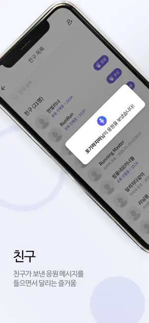 응원하기 기능으로 친구를 응원하면 달리는 친구에게 격려의 메시지가 도착하고 친구에게 음성으로 응원을 해줍니다.