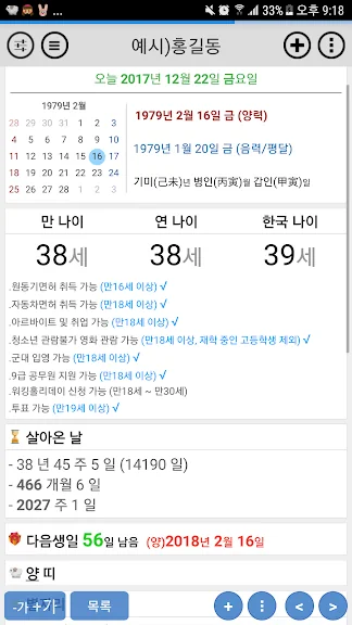 아래는 만나이/음력생일/아기 개월수 어플에 대한 스크린샷 정보입니다.