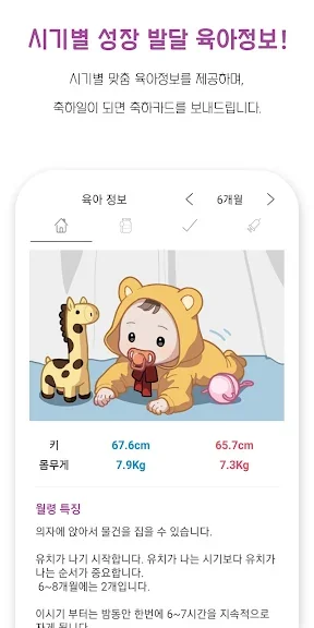 임신 중에는 출산 예정일을 등록해 놓으면, 출산까지 남은 일수, 임신 일수, 주수, 개월수 및 맞춤형 태아 정보를 알림으로 제공받을 수 있습니다. 또한, 시기별 맞춤 육아 정보와 함께 축하일이 되면 특별한 축하 카드도 보내드립니다.