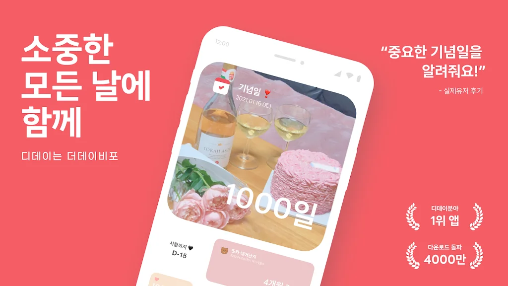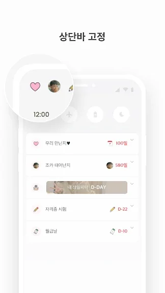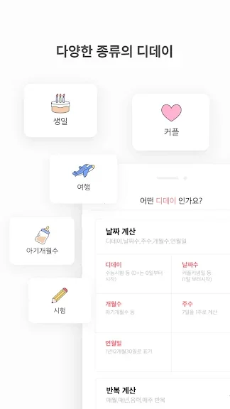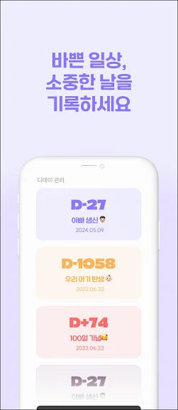 자동 계산된 기념일 리스트는 100일 단위로 제공되어 일정을 손쉽게 관리할 수 있습니다. 디데이 7일, 3일, 1일 전 및 당일 알림 기능은 중요한 날을 놓치는 일이 없도록 도와줍니다. 또한, 스티커와 다양한 배경 효과, 글꼴, 색상 등으로 자신만의 디데이를 꾸밀 수 있으며, 홈 화면 위젯에서 원하는 디자인을 바로 확인할 수 있습니다.