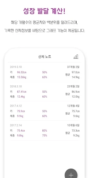 어머니의 걱정을 덜어주는 신체 노트 기능을 통해 아기의 키와 몸무게를 기록하면, 해당 개월수의 평균치와 백분위를 한눈에 파악할 수 있습니다. 기록된 신체 정보는 그래프로 제공되어 아기의 성장 추세를 쉽게 이해할 수 있습니다.