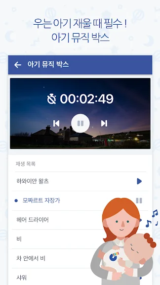 아기에게 맞춤형 정보를 제공하고, 육아 잡지와 제휴된 기사들도 확인할 수 있어 부모에게 더 많은 정보와 팁을 제공합니다. 자장가와 자연의 소리로 아기를 편안하게 할 수 있는 뮤직 박스 기능도 있어 육아를 더욱 즐겁고 편리하게 만들어 줍니다.