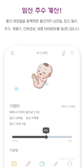 임신 중에는 출산 예정일을 등록해 놓으면, 출산까지 남은 일수, 임신 일수, 주수, 개월수 및 맞춤형 태아 정보를 알림으로 제공받을 수 있습니다. 또한, 시기별 맞춤 육아 정보와 함께 축하일이 되면 특별한 축하 카드도 보내드립니다.