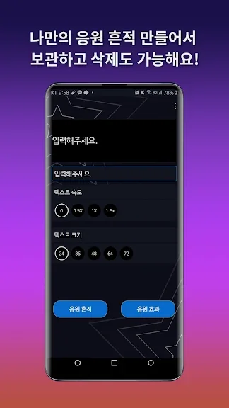앱은 다양한 응원 효과를 제공해 더욱 재미있고 멋진 분위기를 만들어줍니다. 내가 만든 응원 메시지는 저장해서 나중에 다시 사용할 수 있으며, 마음에 들지 않으면 삭제도 간편하게 할 수 있습니다.