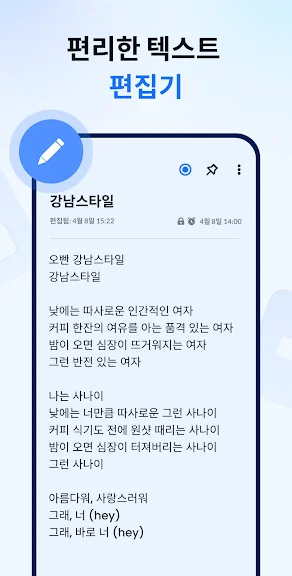 간편한 메모 작성: 텍스트만으로 빠르고 간단하게 메모를 기록할 수 있습니다. 특별한 설정 없이 바로 사용할 수 있어, 빠르게 아이디어를 적어 놓거나 중요한 정보를 메모하는 데 유용합니다.