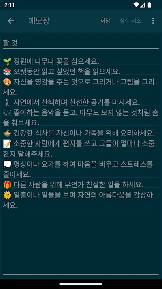 체크리스트 기능: 해야 할 일을 목록으로 관리할 수 있는 체크리스트 기능이 제공됩니다. 각 항목을 체크하거나 수정할 수 있어, 할 일 목록을 쉽고 효율적으로 관리할 수 있습니다. 중요한 업무나 일상적인 할 일을 정리하는 데 매우 유용합니다.
