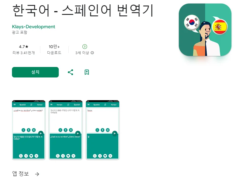 이 어플은 구글플레이스토어에서 "스페인어 번역"로 검색했을때 4번째로 나오는 어플입니다. 아래는 말하는 번역기 - 실시간 초간편 번역, 통역, 회화 어플에 대한 자세한 설명이니 참고하세요.