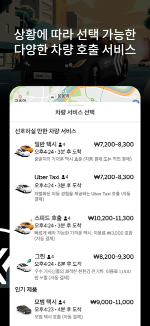 차별화된 이동 경험을 제공하는 Uber Taxi부터, 최대한 가까운 택시를 호출할 수 있는 일반 택시, 빠르게 배차 가능한 스피드 호출 옵션과 친환경 전기차 옵션까지!