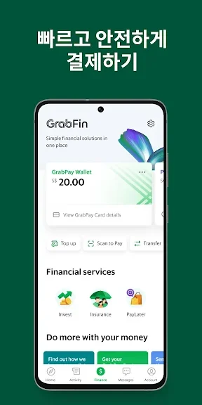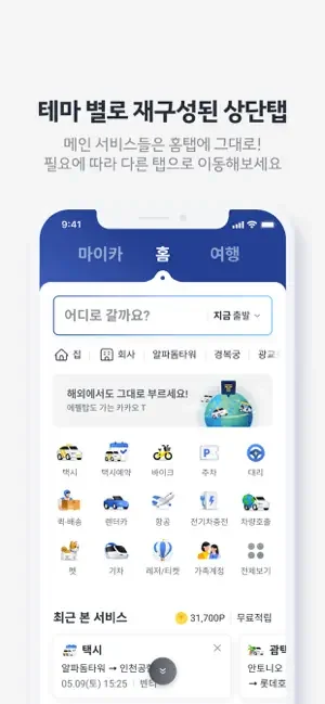 • 홈 탭: 메인 서비스들과 신규 서비스