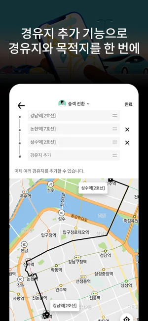 차량 호출 시 앱 내 경유지 추가 기능을 활용해보세요. 기사님께 말하지 않아도 호출 한 번으로 원하는 경유지와 최종 목적지까지 편안하고 합리적으로 이동할 수 있습니다.