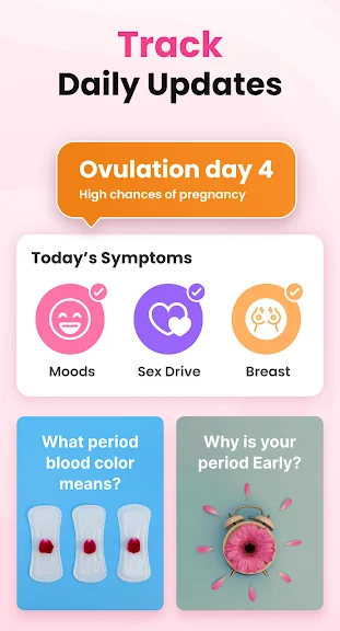 생리 추적기 - 배란 및 임신 달력은 간단하면서도 예쁜 디자인으로 제작되어 주기를 확인하고 다음 생리 날짜, 가임 기간 및 배란일을 예측할 수 있습니다.