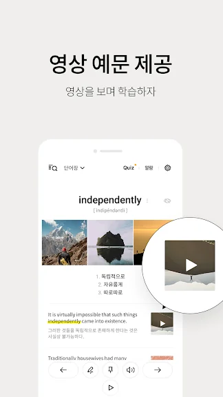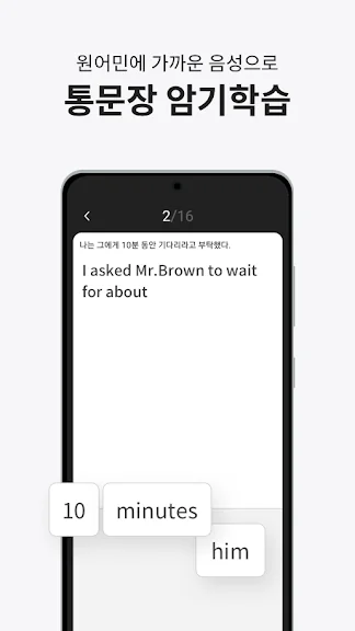 • 단어의 예문과 스마트한 알고리듬이 가장 효과적으로 우리의 영어를 지도해 줄 거예요. 그래서 여러분은 빠르게 단어를 외우고 오래동안 기억할 거예요.