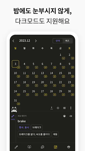 • 공부 통계: 이 기능을 통해서 일주일 전, 한 달전, 3 개월 전 그리고 1 년전 외운 단어를 추적할 수 있어요.