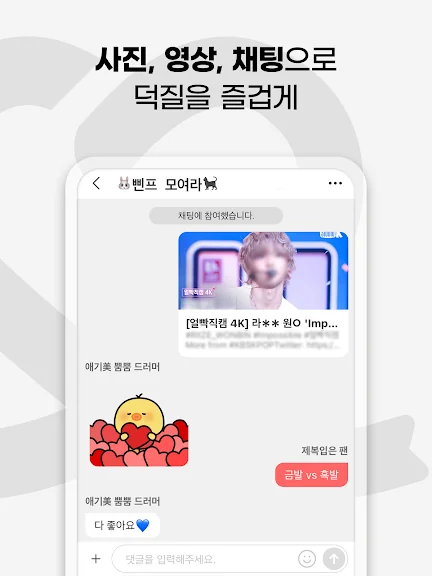 실시간 kpop 투표와 순위 확인, 고화질 배경화면, 스케줄, 연예인 닮은 얼굴 테스트, 팬덤 커뮤니티, 광고 서포트, 위키, 퀴즈 등 덕질에 필요한 모든 기능을 제공해요.