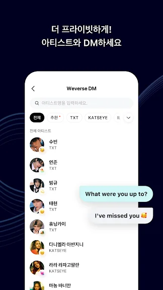 · 아티스트와 프라이빗하게 대화하는 메시지 서비스 위버스 DM을 구독하고 아티스트와 DM 하는 사이가 되어보세요