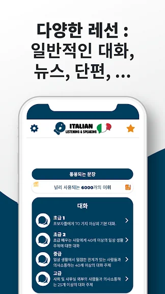 아래는 이탈리아어 공부하기 ☆ 듣고 말하기 연습 어플에 대한 스크린샷 정보입니다.