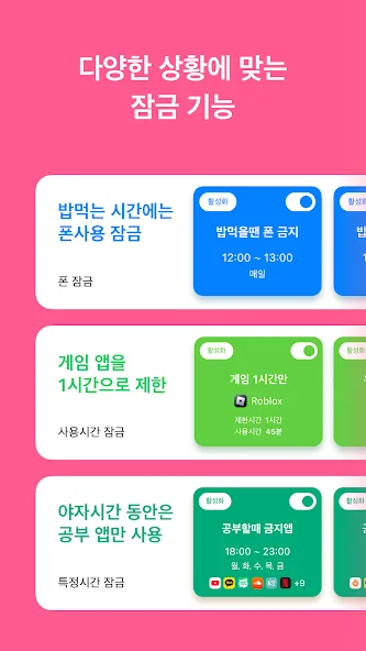 • 특정 시간 잠금: 야자 시간엔 공부 앱만 사용