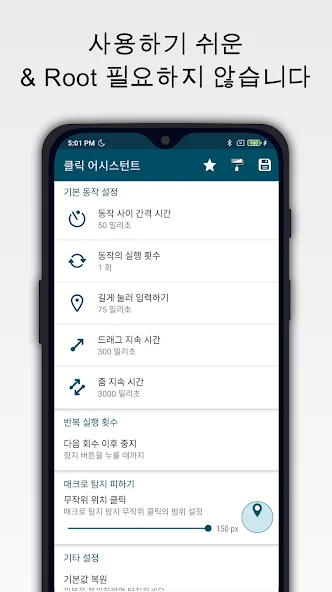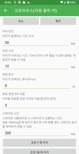 설정을 통해 전반적인 터치 간격, 터치 시간, 반복 횟수를 설정할 수 있습니다(퀵설정 지원)