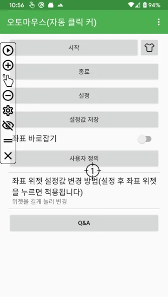 오토마우스는 플로팅 제어판을 통해 자동터치를 시작/종료합니다. 제어판으로 화면에 터치좌표를 띄워 자동터치를 시작해보세요!