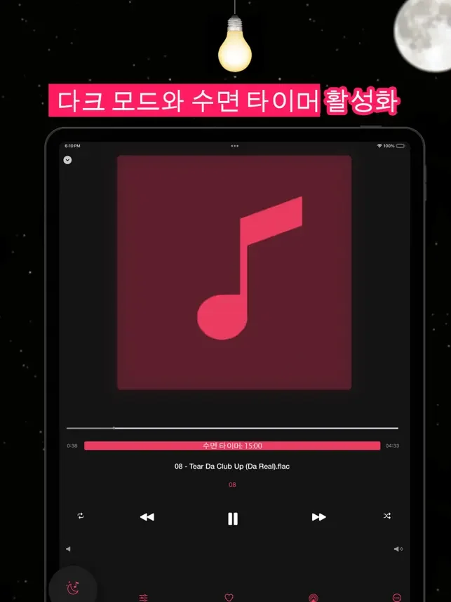 * 취침 타이머: 좋아하는 음악을 들으며 잠들 수 있습니다. 음악을 시작한 다음 카운트다운 타이머를 설정합니다. 카운트다운이 끝나면 앱이 음악을 부드럽게 중지합니다.