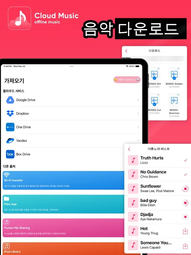 이 애플리케이션을 통해 다음과 같은 클라우드 서비스에서 음악을 다운로드해 기기에 저장할 수 있습니다.