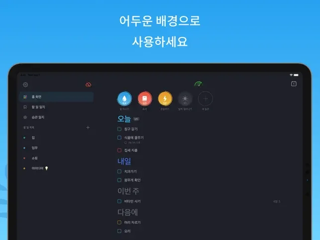 • 홈 화면에서는 모든 작업을 한눈에 볼 수 있고 스와이프 한 번으로 각 일정을 편집할 수 있습니다.